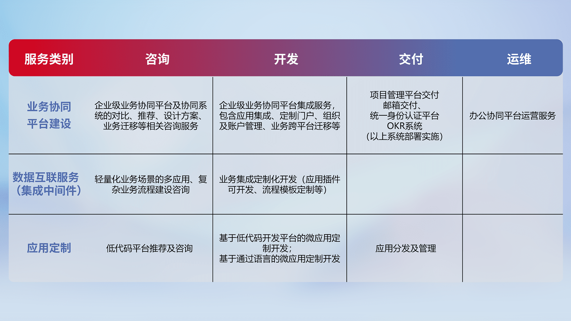针对钉钉、、、、企微、、、IDaas等平台级产品提供产品的规划、、方案、、交付、、、、定制化开发等服务,,,实现如统一协同办公、、、、智能客户服务、、混合会议管理、、、智能数据查询、、、、等业务场景,,实现数字化转型。。。。